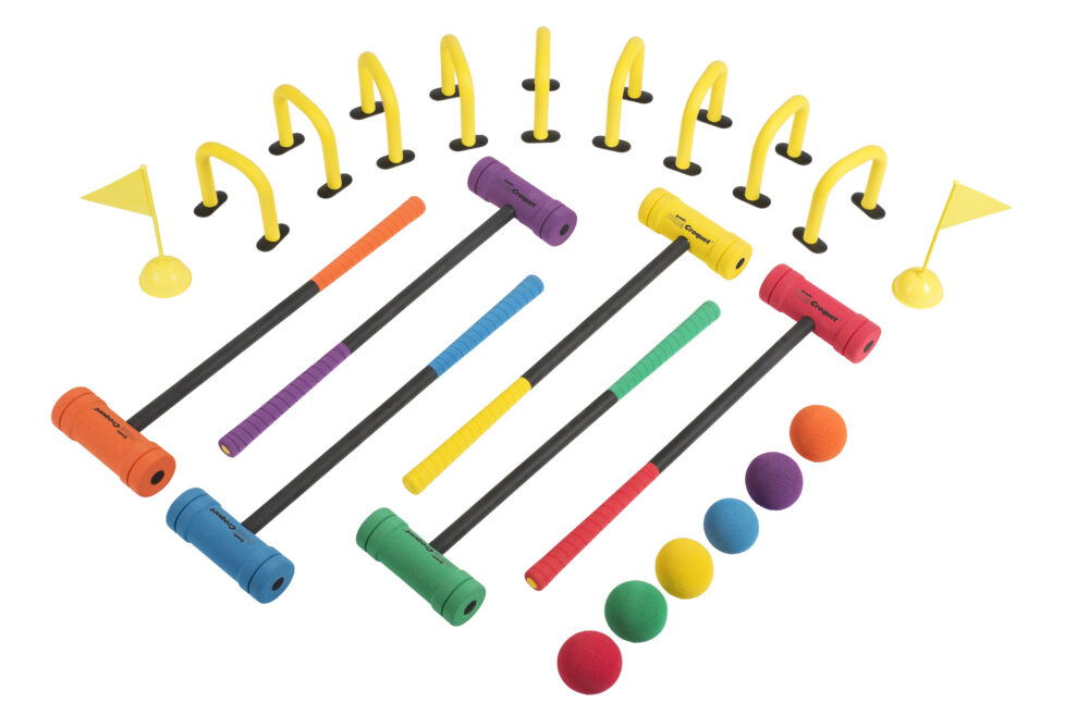 Iekštelpu Kriketa komplekts ir jautrs un drošs spēlēšanai. Košas krāsas, putu mīksta gumija padara to pietiekami izturīgu un piemērotu visu vecumu cilvēkiem. Katram āmuram ir arī 22 cm superputu rokturis.