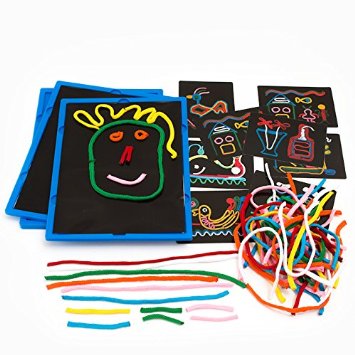Komplektā 4 lipīgās pamatnītes, 50 aukliņas, 8 divpusējas paraugu kartiņas. Var veidot zīmējumus, burtus, ciparus. Aukliņas pēc tam ir noņemamas un izmantojamas atkārtoti.