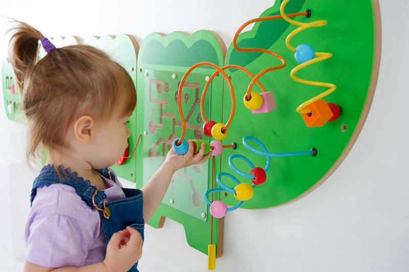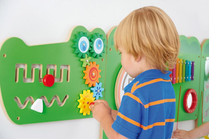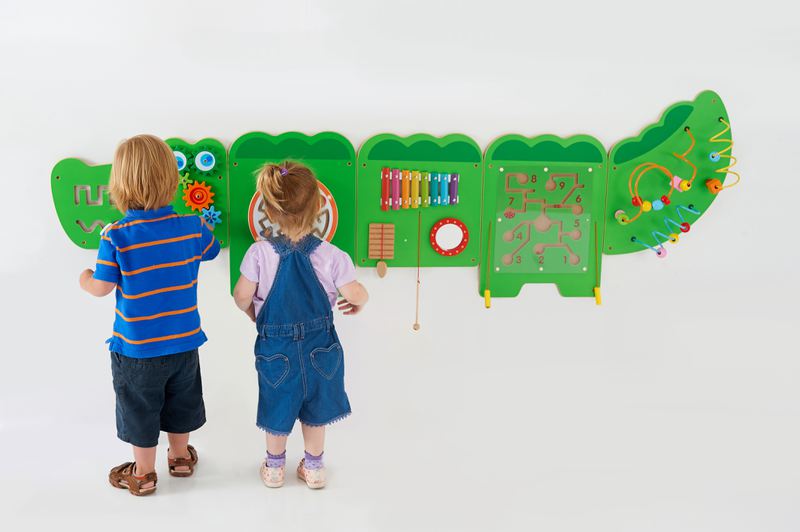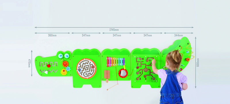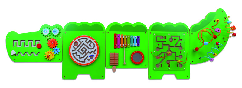 Spilgta un izteiksmīga uzmanību piesaistoša koka manipulatīvā siena krokodila formā.Manipulatīvā siena sastāv no piecām sadaļām, katra sadaļa piedāvā savu aktivitāšu tēmu, kas ir saistītas ar acu-roku koordinācijas, sīkās pirkstu muskulatūras attīstību. Uz sienas ir sekojošas aktivitātes:- perkusiju mūzikas instrumenti- magnētiskais labirints ar bumbiņām un magnētisko nūjiņu, – spogulis, – vairāki labirinti, – vēršana, zobratu griešana.Pie sienas var spēlēties un sadarboties (vienoties par aktivitātēm, kā arī sarunāties u.c.) vairāki bērni. Komplektā ietilpst pieci atsevišķi paneļi, kurus savstarpēji sastiprina ar skrūvēm, tam paredzētajos caurumiņos. Manipulatīvā siena ir paredzēta lietošanai tikai iekštelpās.Izmērs: norādīts attēlāVecums: 1+Piemērots kolektīvai lietošanai