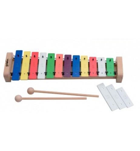 Metalofons ar krāsainiem taustiņiem koka rāmī.12 + 3 toņi, c3 – g4, fiz3, bb3, fis4. Komplektā 2 koka vālītes.