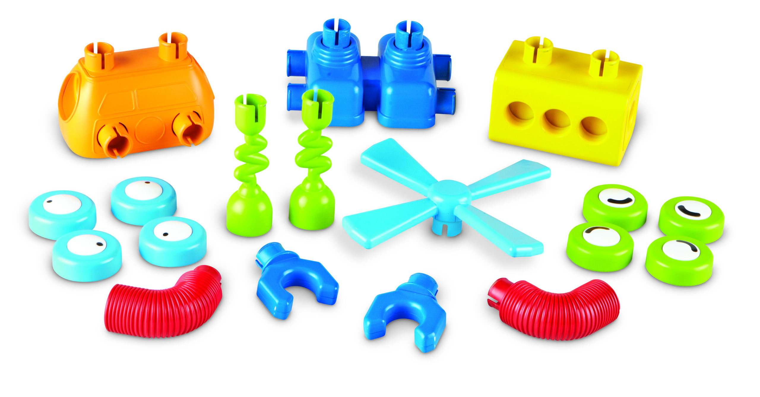 Komplektā ietilpst: 18 detaļas ir viens zils robota pēdu bloks, viens dzeltens celtniecības bloks, viens oranžs celtniecības bloks, viena zila dzenskrūve, divas sarkanas robota rokas, divas zilas robota rokas, divas zaļas kustīgas detaļas un četras robota acis.