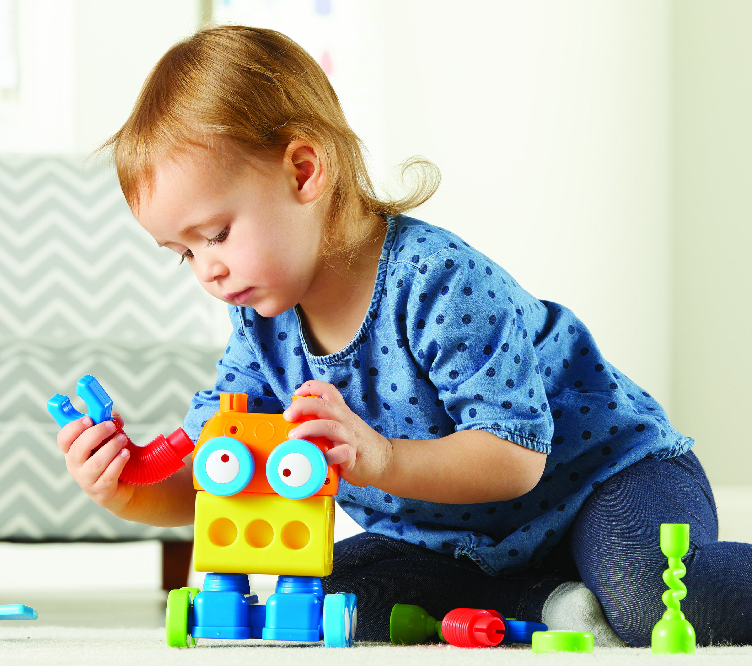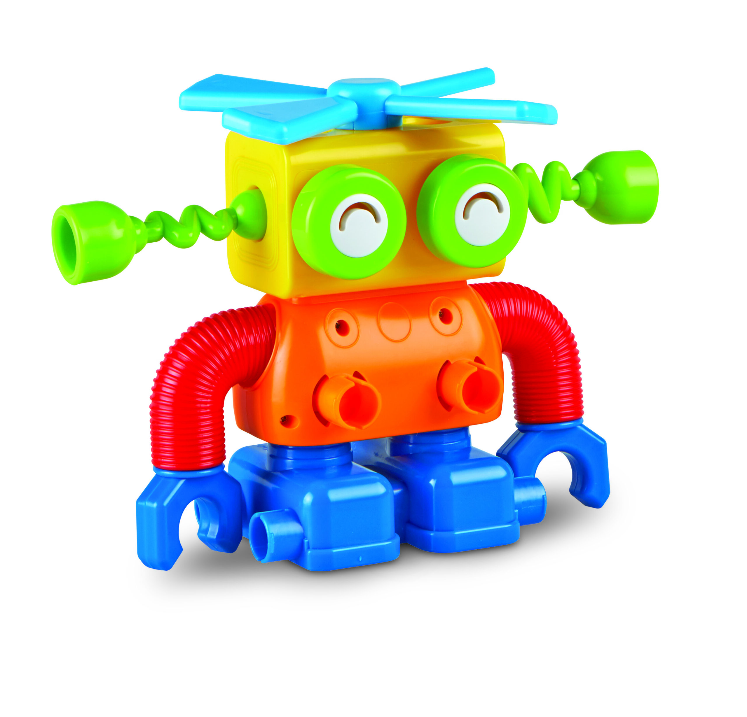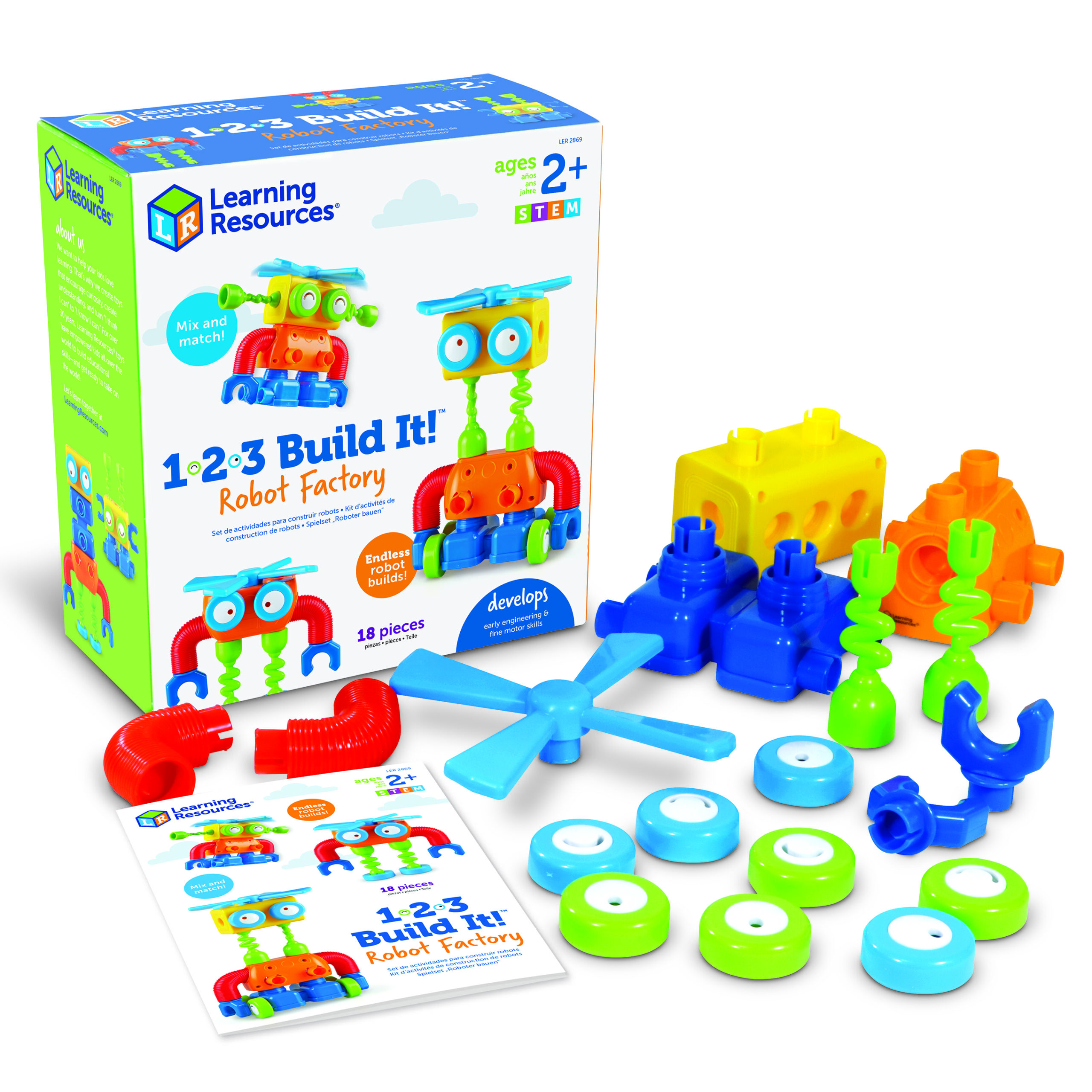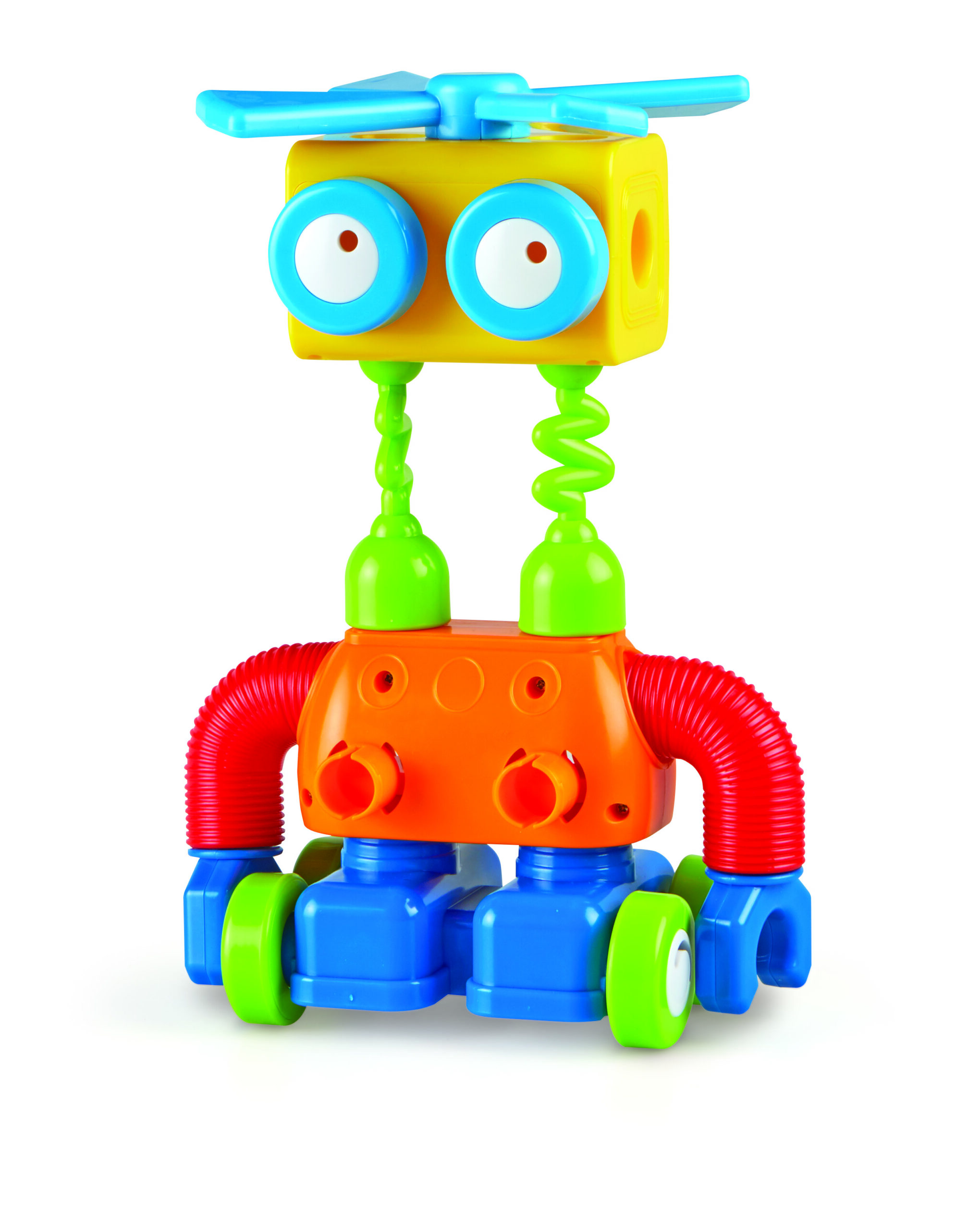 Sajauciet, salāgojiet, salabojiet, piestipriniet un izveidojiet savu kustīgo robotu savā robotu rūpnīcā! Izveidojiet garu robotu ar slīdošām zaļām kājām, pievienojiet acis, lai robots varētu redzēt un tad uzspiediet uz propellera! Šī konstruktora biezās plastmasas detaļas ir piemērotas mazām rociņām, ir gatavas palīdzēt pirmsskolas vecuma bērniem izstrādāt, būvēt un izdomāt savu robotu rotaļlietu.