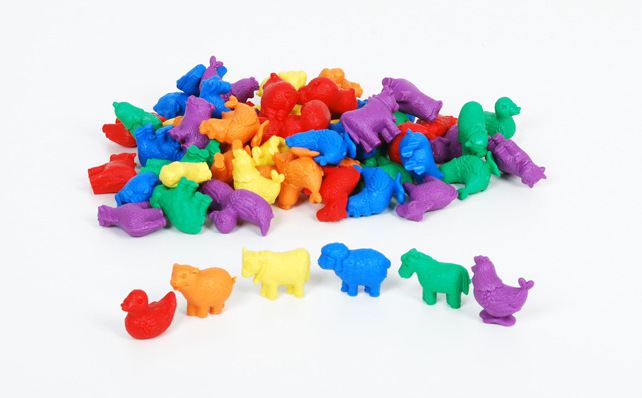 Komplekts ar sešu veidu detalizēti izstrādātām fermas dzīvnieku figūriņām (vista, govs, pīle, zirgs, cūka un aita) sešās krāsās (sarkans, zils, zaļš, dzeltens, violets un oranžs). Šis komplekts ir piemērots kā mācību materiāls skaitīšanā, sortēšanā, ritmu likšanā, kā arī pielietot vienkāršotu matemātisku darbību izpratnei – saskaitīt, atņemt, dalīt vai reizināt. Izmērs: apm 40mm.Komplektā ietilpst 72 dzīvnieku figūriņas.Vecums: 3+Piemērots kolektīvai lietošanai.