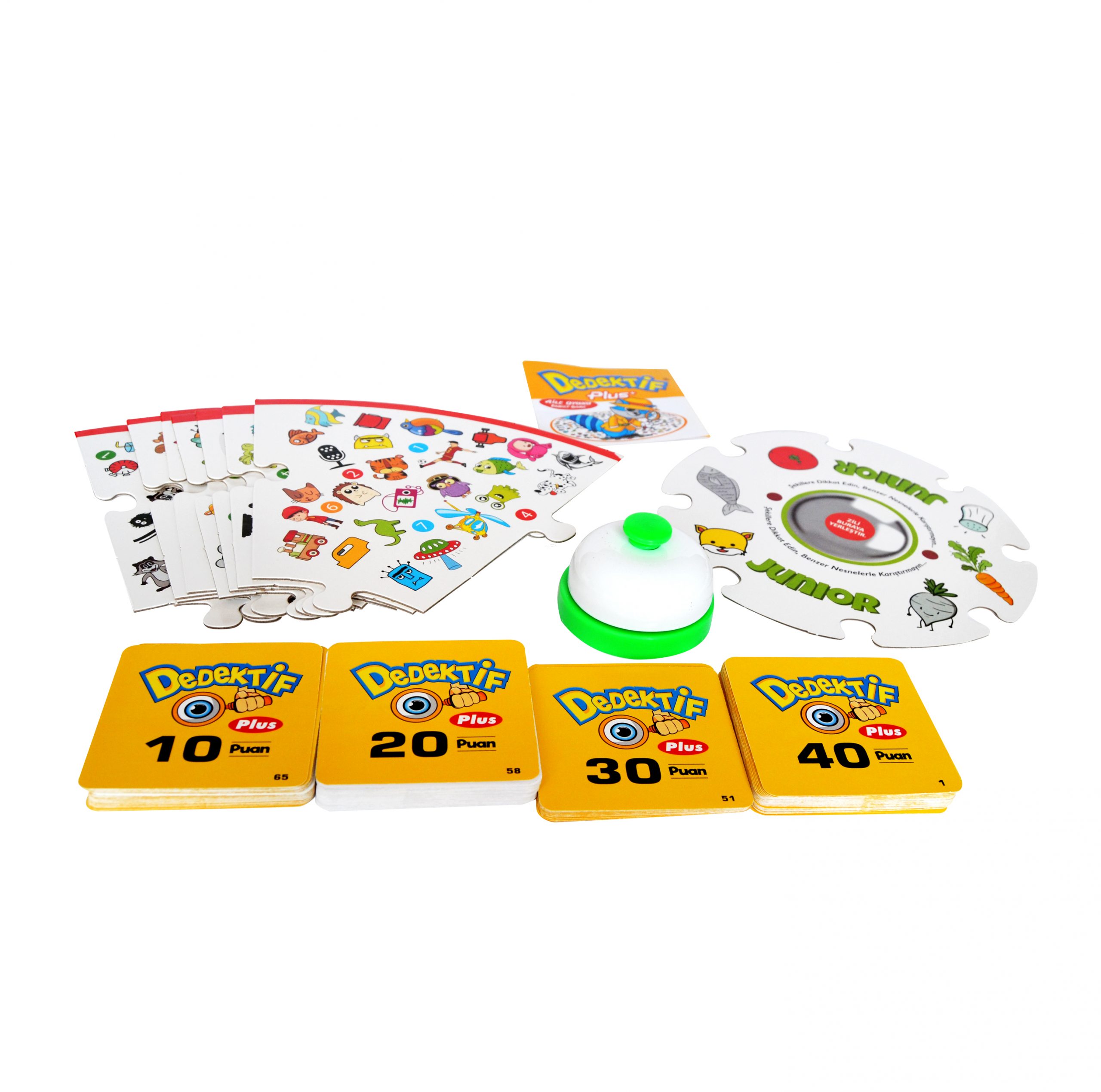 Komplektā ietilpst: spēles laukums, 70 Lielā detektīva kartiņas, 35 junioru detektīvu kartiņas, 1 galda zvaniņš.