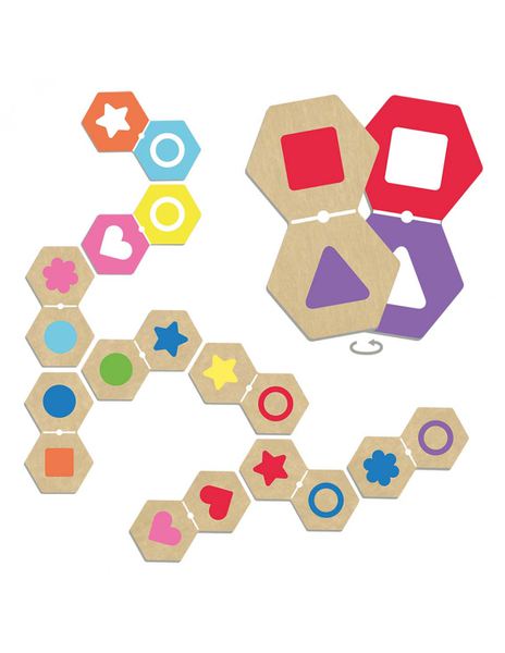 Jautra domino spēle, kas īpaši piemērota selektīvas uzmanības trenēšanai, vēršot uzmanību uz dažādajām formām un krāsām. Lai izveidotu asociāciju, ir jāpievērš uzmanību vienam figūru atribūtam, formai vai krāsai.Apgriežamas divpusējās kartiņas ļauj spēlēt šo domino dažādos veidos.Spēles mācību mērķi:> telpiskā orientācija> Uzlabot vārdu krājumu un izteikšanās spējas> stāstīšanas prasmes> apgūst formas un krāsas> veicina daudzpusīgas prāta spējasSpēlē ietilpst: 28 liela izmēra domino gabaliņi (13 x 6.5 cm) 15 apaļas kartiņas ( skaitīšanai, cik raundus vinnējis katrs spēlētājs)Izgatavots no augstas kvalitātes, stingra, izturīga kartona. Vecums: 3+